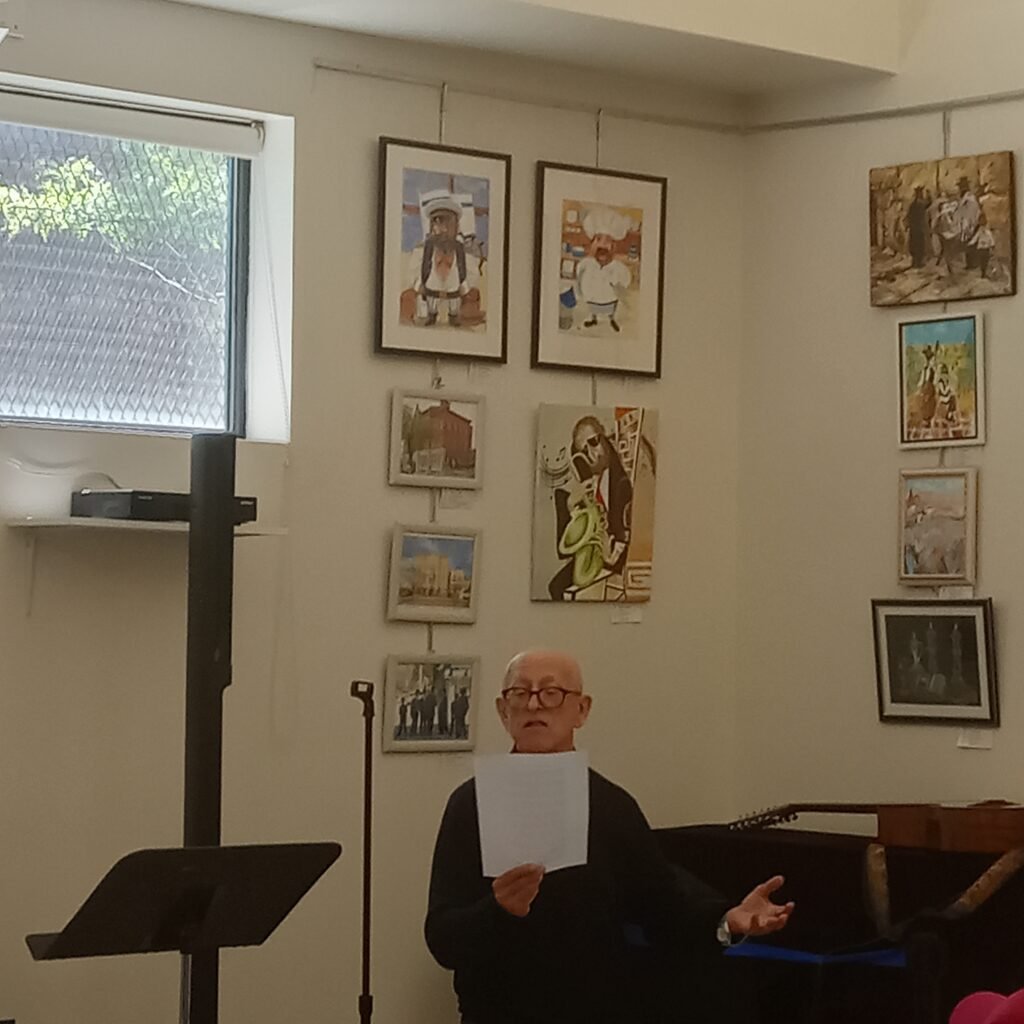 Во вступительном слове президент Гильдии Еврейских Художников Елена Зубок рассказала о представленных в экспозиции работах и их авторах. Ведущим встречи, веселым и находчивым конферансье и исполнителем еврейских песен был президент Одесского Землячества Нью-Йорка Игорь Казацкер.